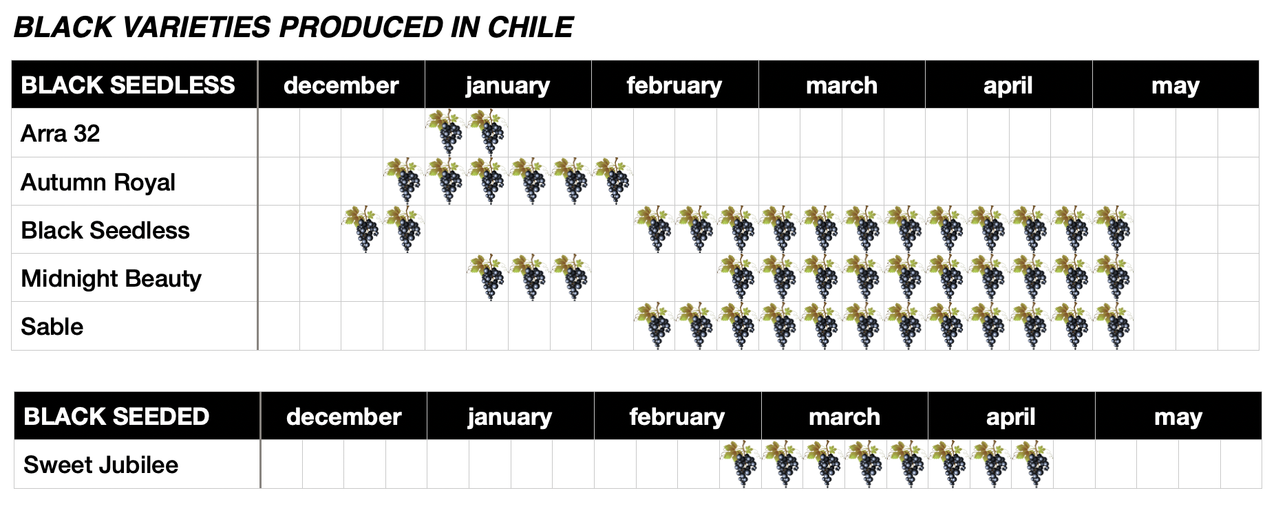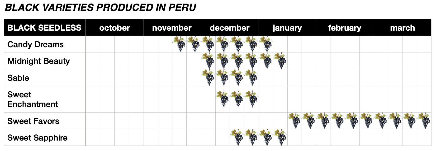 Arra 32, Autumn Royal, Black Seedless, Midnight Beauty, Sable.