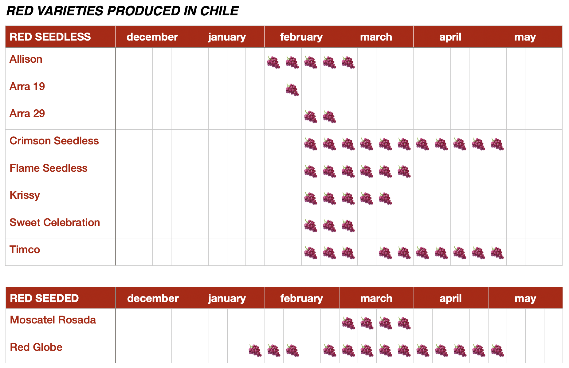 Allison, Arra 19, Arra 29, Crimson Seedless, Flame Seedless, Krissy, Sweet Celebration y Timco