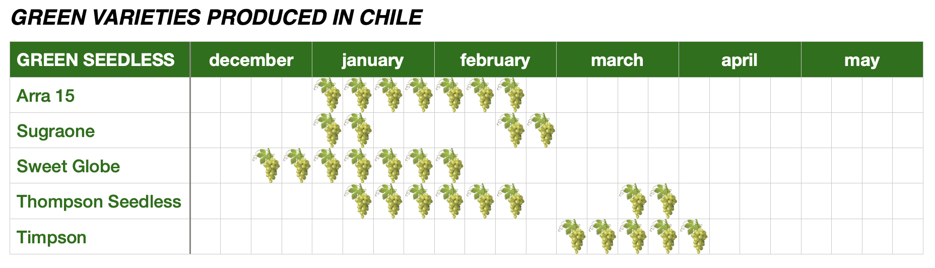 Arra 15, Sugraone, Sweet Globe, Thompson Seedless y Timson.