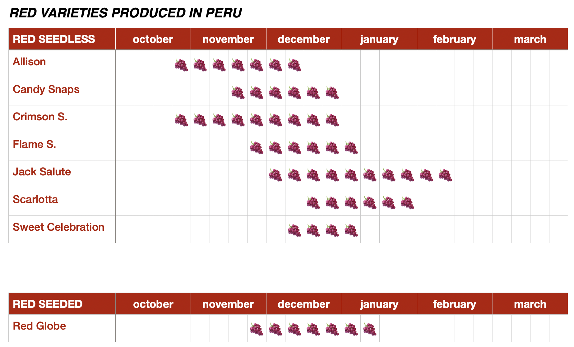 Allison, Candy Snaps, Crimson Seedless, Flame Seedless, Jack Salute, Scarlotta y Sweet Celebration.